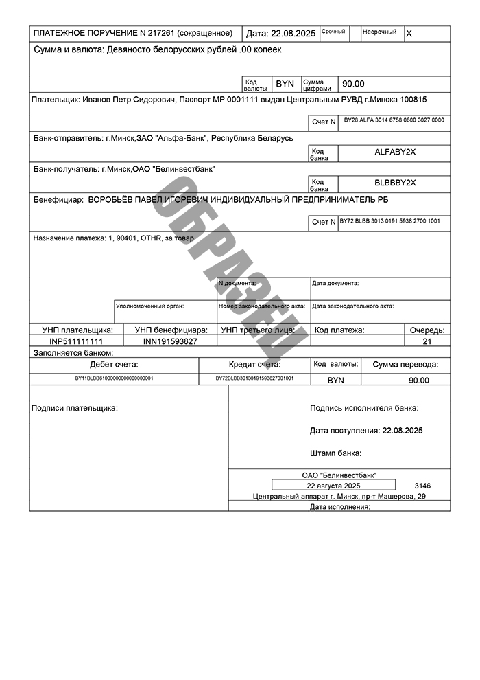 при его получении у курьера в бел.рублях (по возможности, подготовьте деньги без сдачи) в магазине бел.рублями в пунктах выдачи заказов (ПВЗ) бел.рублями в магазине пластиковой картой Visa/MasterCard/Maestro/БелКарт любого банка, эмитированной в любой валюте. безналичным расчётом (для ИП и организаций) в интернет-банкинге (система ЕРИП)